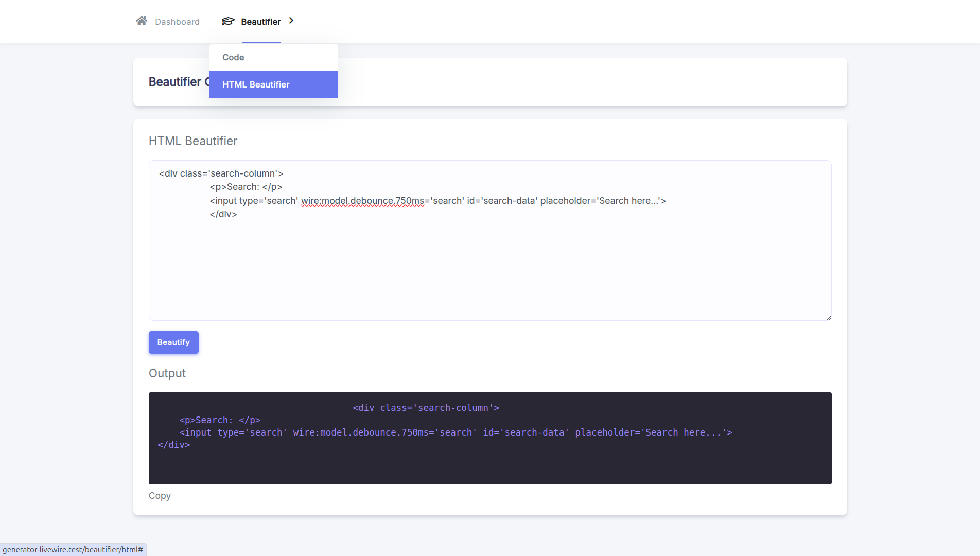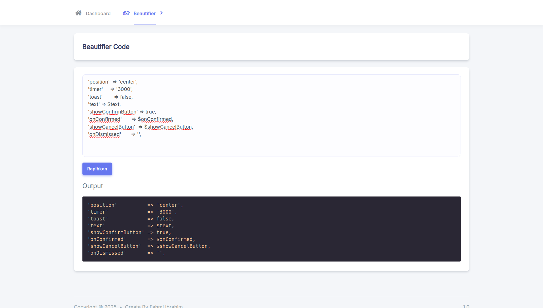 Fitur Code Beautifier disematkan untuk membantu pengembang merapikan snippet kode HTML atau bahasa pemrograman lainnya langsung dari dashboard.