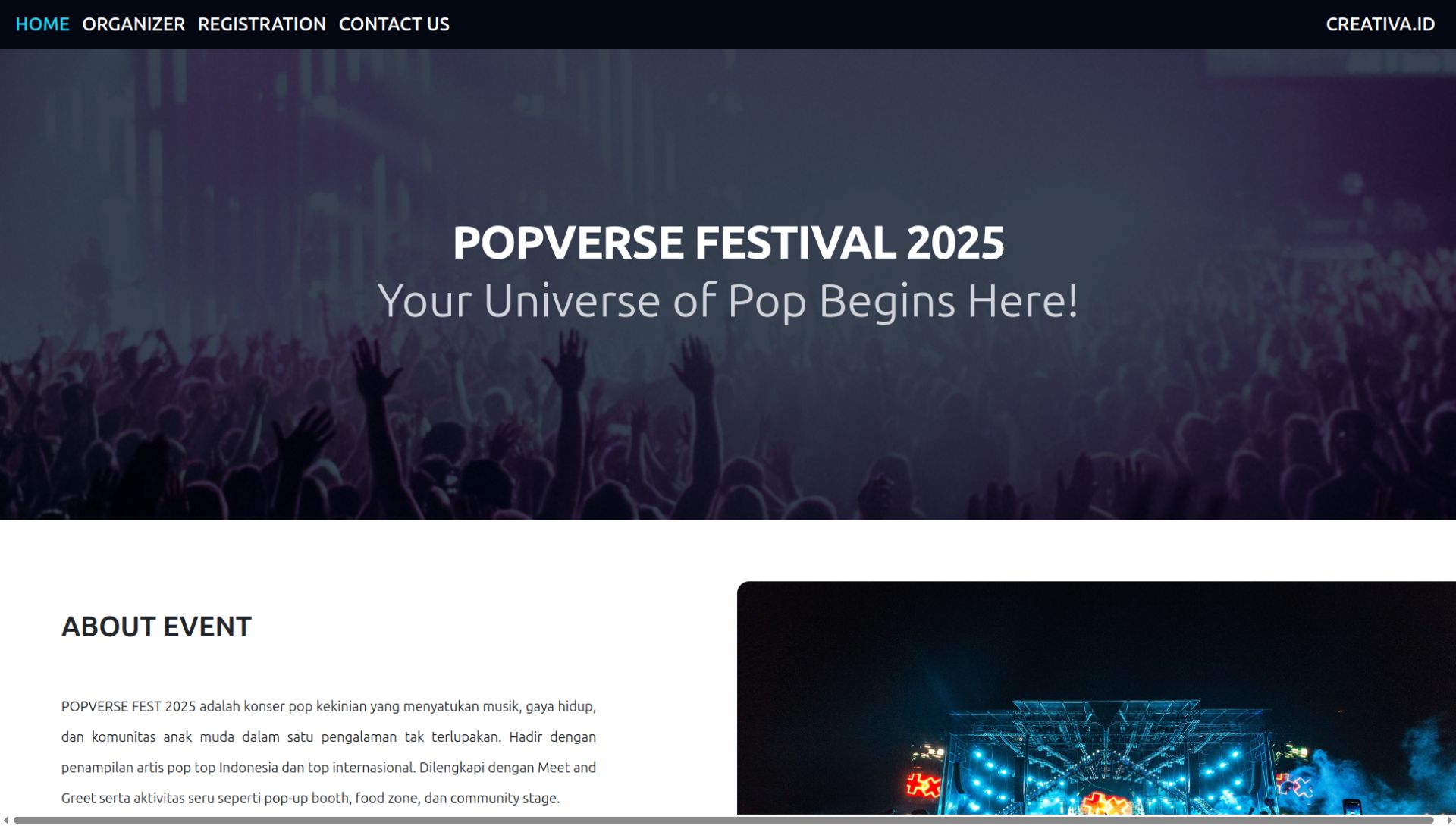Website ini dikembangkan menggunakan Joomla, CMS open-source yang fleksibel dan modular untuk membangun situs web dinamis dan informatif. Situs ini dibuat untuk mempromosikan POPVERSE FEST 2025, sebuah konser pop modern yang menghadirkan gaya hidup, musik, dan komunitas dalam satu wadah interaktif.